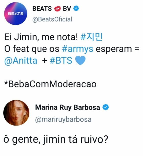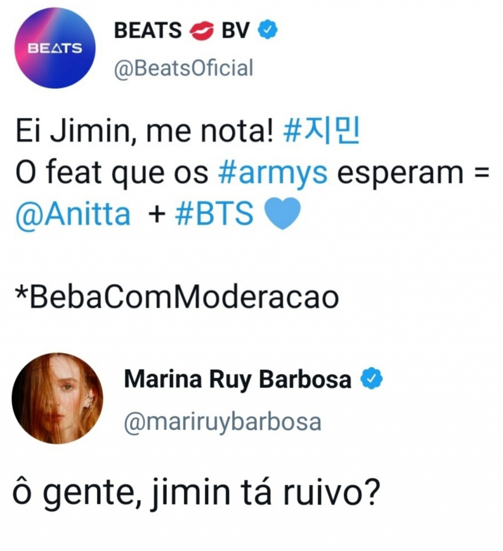 'BTEATS'는 특히 '지민'이라는 한국어 이름으로 각별한 애정을 드러내며 1360만 팔로워를 보유한 브라질 국민가수이자 배우, 진행자 등으로 활동하는 자사 브랜드 마케팅 책임자 아니따(Anitta)까지 소환하며 적극적인 러브콜을 펼쳤다.