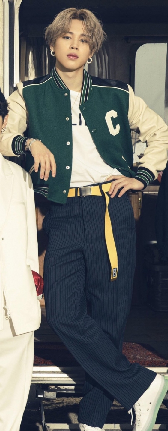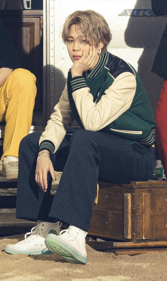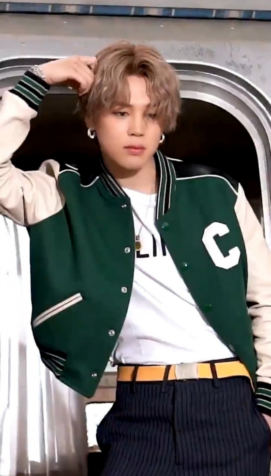 눈부신 금발의 롱 웨이브 헤어 스타일로 부드럽고 스타일리쉬한 분위기를 연출한 지민은 지난해 2월 NBC 인기 모닝 토크쇼 '투데이쇼' 출연 당시 착용으로 화제를 모은바 있는 명품 브랜드 '셀린느'(CELINE)의 흰색 라운드 티셔츠와 블루 팬츠, 아이보리 소매의 그린 울 재킷을 매치 후 노란색 벨트 포인트로 지민만의 아이덴티티가 담긴 완벽한 '패피'로 팬들을 설레게 했다.