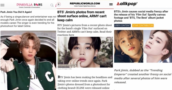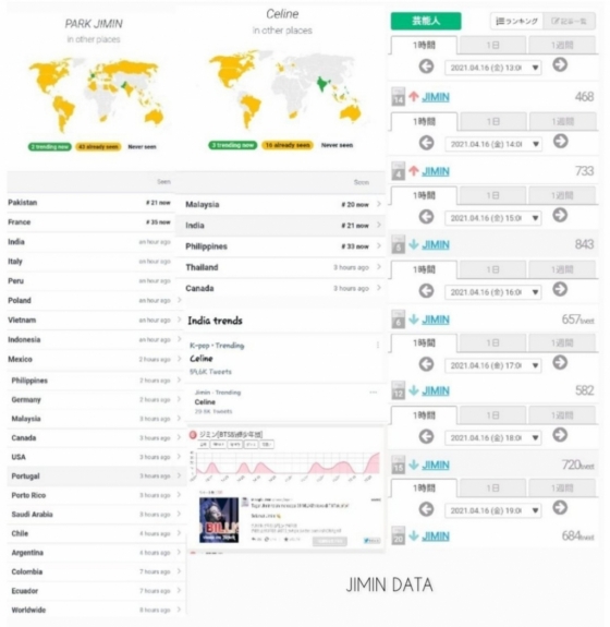 키워드 'Park Jimin'으로 미국, 프랑스, 이태리, 독일, 사우디아라비아 등 수십개 국가에 트렌딩됐으며, 특히 착용의상인 '셀린느'(CELINE)가 5개 국가 트렌드에 올랐다.