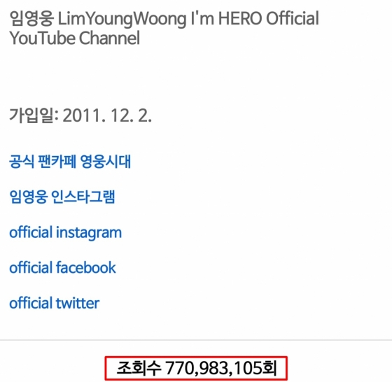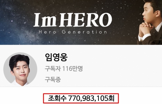 가수 임영웅의 공식 유튜브 채널이 7억 7000만뷰를 돌파하며 인기 고공 행진을 이어갔다.