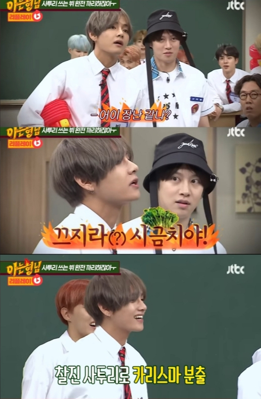 뷔는 뛰어난 예능감으로 '아는 형님'에서 대활약을 펼쳤다. 뷔가 인생 영화 중 하나라고 손꼽는 '바람'을 출연진과 함께 연기한 장면에서 진지한 연기와 더불어 '끄지라 시금치야, 입에서 때나온다'라는 기발한 대사로 시청자들에게 놀라움과 웃음을 안겼다.