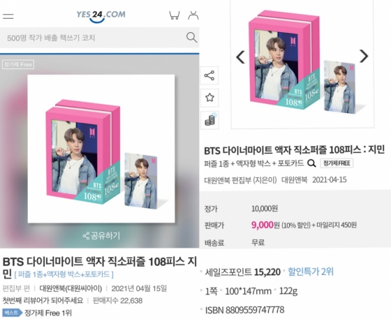 방탄소년단(BTS) 지민의 액자형 직소 퍼즐이 폭발적 인기로 1주일 동안 주간 베스트판매 7종중 1위에 오르며 '28개월 연속 1위'의 막강한 브랜드 파워를 입증했다.