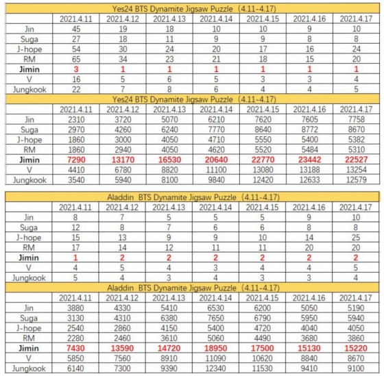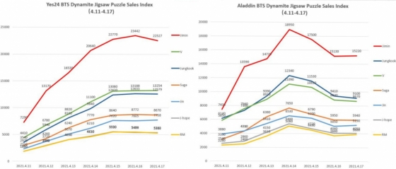 방탄소년단의 정식 라이센스 상품 'BTS 다이너마이트 액자 직소퍼즐' 멤버별 7종 예약 판매가 시작된 이후 지민의 액자 퍼즐이 12일 부터 17일까지 무려 6일간 '예스24' 주간 베스트 셀러 전체 1위를 차지했다.