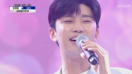 임영웅은 맞대결만큼은 피하고 싶다던 정동하와 극강의 1:1 대결에 나서 시선을 집중시켰다. 이날 사제지간으로 밝혀진 두 사람은 승부를 예상할 수 없는 팽팽한 노래 대결로 안방 열기를 뜨겁게 만들었다. 임영웅은 박상철의 '바보 같지만'을 두 키 올려 부르며 폭발적인 고음과 탄탄한 가창력으로 또 하나의 레전드 무대를 탄생시켰다.