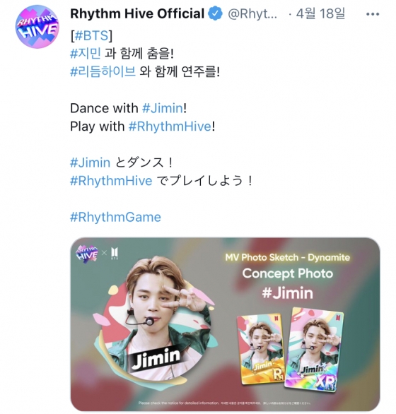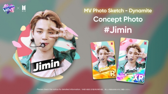 빅히트 게임 부문 '수퍼브'가 출시한 모바일 리듬게임 '리듬하이브'(Rhythm Hive) 공식 계정은 지난 18일 게임에 등장하는 지민의 'MV Photo Sketch - Dynamite concept photo'를 공개했다.