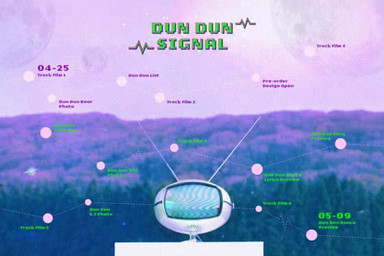 특히 이미지의 중앙 상단에는 'DUN DUN SIGNAL'이라는 문구가 적혀있고, 스케줄에도 'Dun Dun OMG Photo', 'Dun Dun MIMI Day', 'Dun Dun E.T Photo' 등 앞서 공개된 타이틀곡 'DUN DUN DANCE'를 떠올리게 하는 문구들이 기재되어 이번 신보의 콘셉트와 티저 콘텐츠들에 대한 호기심을 자극하고 있다.