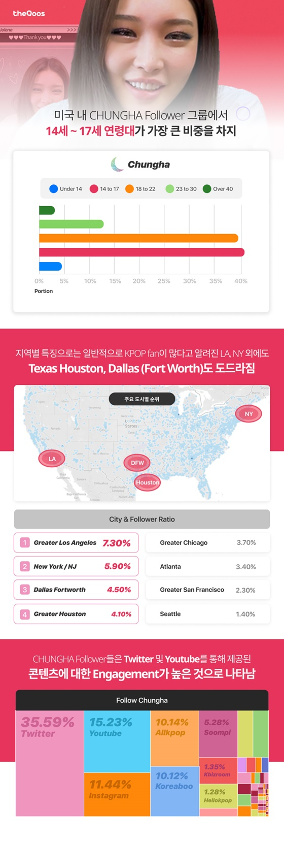 미국 맞춤 케이팝 앱 서비스를 운영하는 더쿠스(TheQoos, 대표 한가람)는 22일 북미 시장에서 청하의 존재감과 팬덤 '별하랑'을 분석한 결과를 내놓았다.