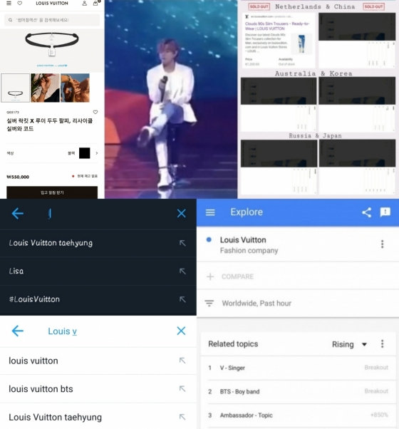 루이 비통과의 협업이 알려진 후 루이 비통의 트위터 연관검색어에는 뷔의 이름이 자동검색어로 떠올라 명품브랜드의 앰배서더로서 뷔의 활약을 기대케 했다.