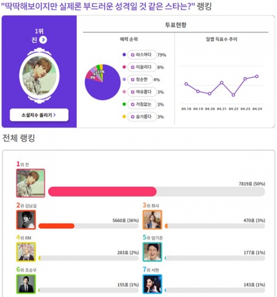 진은 익사이팅디시가 지난 18일부터 24일까지 진행한 '딱딱해 보이지만 실제론 부드러운 성격일 것 같은 스타는?' 투표에서 총 1만 5734표 중 7819표(50%)로 1위에 올랐다.