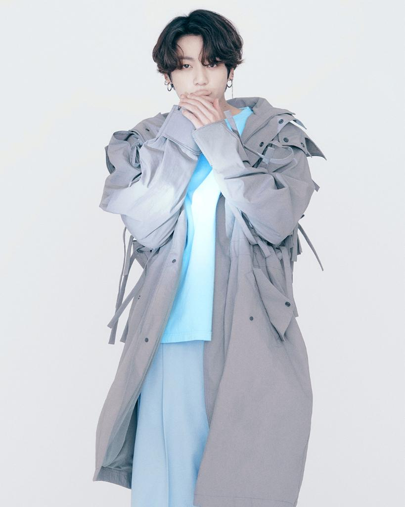 이 중 멤버 정국은 우월한 전신 비율과 바디 피지컬로 파스텔 톤 하늘색의 상하의, 그레이 톤 롱 재킷의 심플한 패션을 완벽 소화하며 시선을 사로잡았다.