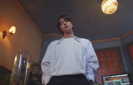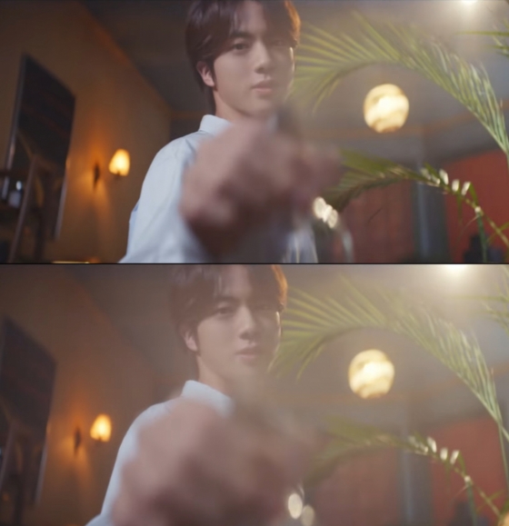 카메라는 아래에서부터 진의 모습을 잡았고, 진의 큰 눈망울과 높은 콧대, 도톰한 입술, 계란형의 작은 얼굴이 돋보이며 어느 각도에서든 굴욕 없는 미모로 놀라움을 안겼다.