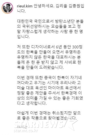 김리을 디자이너는 이어 "대한민국 국민으로서 방탄소년단 분들의 국위선양하시는 모습들을 보고 정말 자랑스럽게 생각하는 사람 중 한 명입니다"라며 "저 또한 디자이너로서 6년 동안 300정도의 한복을 만들어 오면서 유명하든 유명하지 않든 한국을 대표하시는 분들께 돈 한 푼 받지 않고 제 사비로 한복을 만들어 드려왔습니다. 이번 경매 또한 중국이 한복이 자기네 꺼다라고 우기는 시기에 우리나라 고미술 대표 옥션인 마이아트 옥션에서 정말 좋은 제안을 주셔서 한복경매 이상의 의미를 가질 수 있는 좋은 기회였다고 생각합니다. 아쉽게 이번 경매는 취소됐지만 앞으로 좋은 작품으로 찾아뵙겠습니다"라고 전했다.