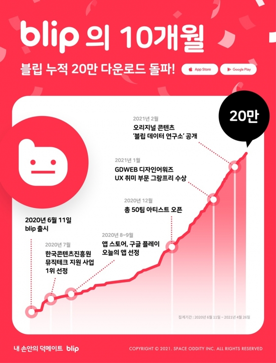 블립은 작년 6월 출시 이후 10개월만에 20만 다운로드를 달성했다. 지난 10개월 동안 한국콘텐츠진흥 뮤직테크 지원 사업 1위에 오르기도 했고, 애플 앱스토어와 구글 플레이 스토어에서 오늘의 앱으로 선정되기도 했다. 그 사이 해외 팬들의 사용이 증가해 블립 영어 버전과 일본어 버전을 오픈했다. 블립의 유저 중 40%는 해외 케이팝 팬들로 전세계 케이팝 팬들 사이에서 '입덕'의 문턱을 낮춰주고 덕질을 더욱 즐겁게 해주는 앱으로 자발적인 지지를 쌓아가는 중이다.