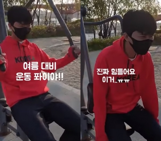 공개된 영상 속 임영웅은 멀리 성산대교가 보이는 망원 한강공원에서 공원 운동 기구를 이용해 근력 운동을 하고 있다.