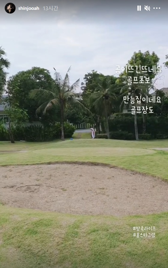 신주아는 지난달 30일 자신의 인스타그램 스토리에 "공이 뜨긴 뜨네요. 골프 초보. 만능 집이네요. 골프장도. #방콕라이프 #홈스타그램"이라며 사진을 게재했다.