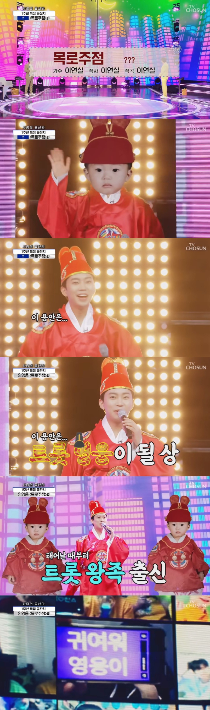 영상은 임영웅의 깜찍한 아기 때 모습으로 시작부터 시청자들의 눈을 사로잡았다. 이어 멋지게 곤룡포(袞龍袍)를 차려입은 '트로트 왕' 임영웅이 등장해 흥겨운 무대를 이어갔다. 임영웅의 돌잔치 복장과 똑같이 재현한 무대 의상이 눈길을 모았다.