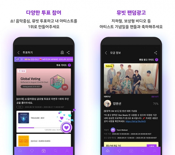 또한 2018년 초부터 브라질 등 해외에서 지상파 및 케이블 방송사의 클립 영상을 아티스트별로 모아서 서비스하기 시작했고 2020년 초에는 국내에 정식 론칭해 '쇼! 음악중심' 등 음악방송 공식 투표 앱으로 사용되고 있다. '2020 가온차트 어워즈'와 전 세계 케이팝 팬덤 102만 명이 참여한 '2020 뮤빗 어워즈' 등을 진행하며 케이팝 플랫폼 격전에 합류했다.