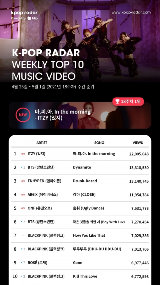 ITZY(있지) 케이팝 레이더 차트 1위.."'마.피.아. In the morning' 뮤비 17시간 만에 1천만뷰, 'Not Shy' 보다 1시간 기록 단축" [공식]