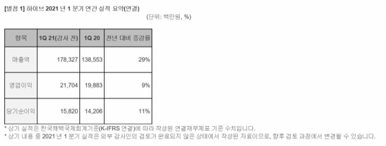 하이브(HYBE, 의장 방시혁)는 올 1분기에 매출액 1,783억 원, 영업이익 217억 원(K-IFRS 연결 기준, 외부 감사인의 검토 완료되기 이전 회사의 가결산 수치)을 기록했다고 4일 밝혔다. 2020년 1분기 대비 매출액은 29%, 영업이익은 9% 증가했다.