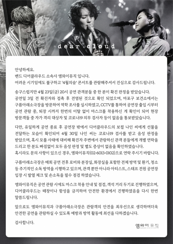 또한 "공연 관람 시에도 마스크 착용 안내 및 점검, 객석 거리 두기로 진행했으며 디어클라우드는 떼창이나 함성을 금지, 안전한 환경에서 진행했다"라며 "철저한 방역 지침 아래 공연장 내부에 확진자가 있었음에도 추가 전파가 되지 않았음을 강조했으며 앞으로도 관람객의 안전을 최우선으로 할 것"이라고 밝혔다.