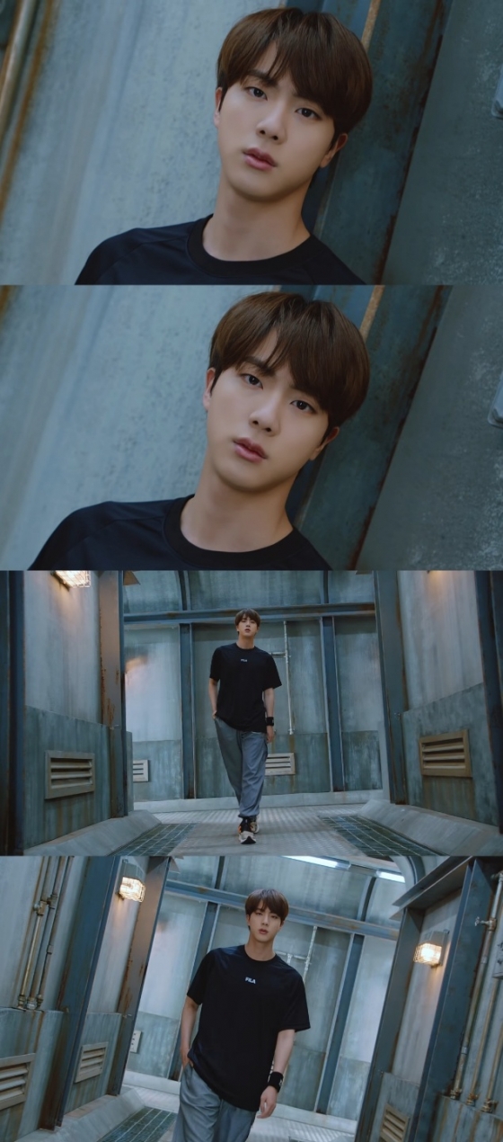 강렬한 눈빛으로 정면을 바라보는 모습으로 등장한 진은 팬들을 다시 한번 '월드와이드 핸섬'의 매력에 빠져들게 했다. 이어 주머니에 손을 넣고 걸어오는 모습으로 카리스마를 발산했다. 진은 기본 반팔티와 트레이닝 바지만으로 환상적인 비율을 자랑해 눈길을 모았다.