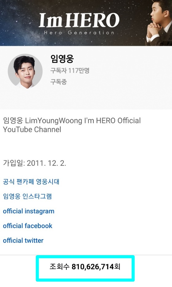 가수 임영웅의 공식 유튜브 채널이 총 조회 수 8억 1000만 뷰를 돌파하며 뜨거운 인기를 이어갔다.