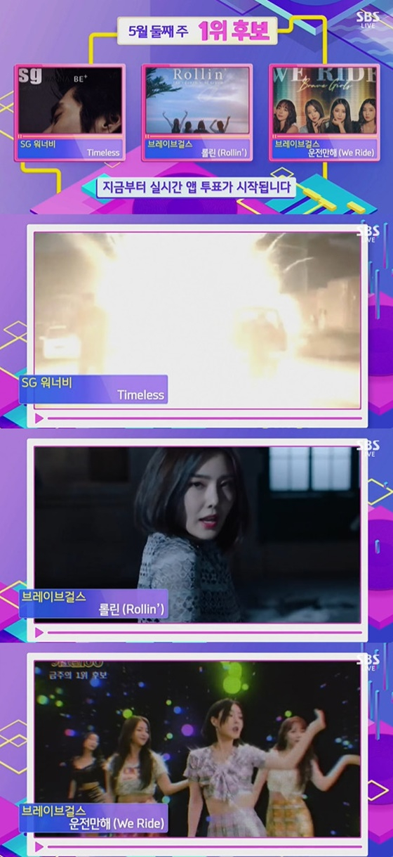 9일 오후 방송된 SBS '인기가요' 에서는 SG워너비의 'Timeless', 브레이브걸스의 '롤린'과 '운전만 해'가 1위 후보에 올랐다.
