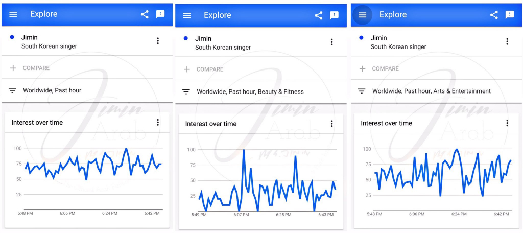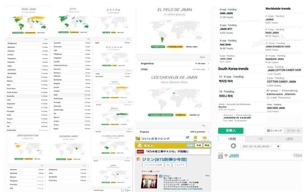 비정상 현상을 보이는 고유 해시태그 #JIMIN 을 제외한 'jimins', 'park jimin', 'jimin rainbow hair', 'rainbow jimin', 'unicon hair', "cottoncandy'등 5개의 월드와이드 실시간 트렌드가 순위에 오르고 총 12개가 유행했다.