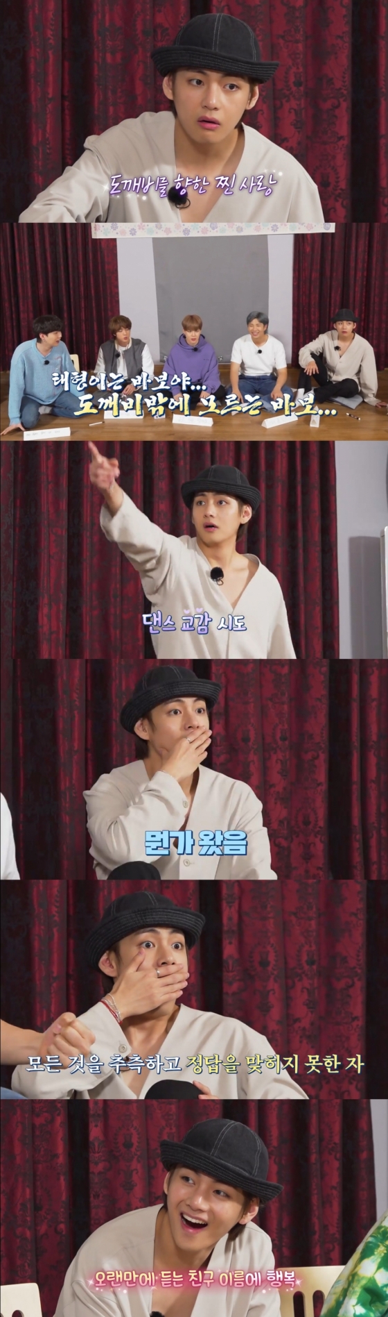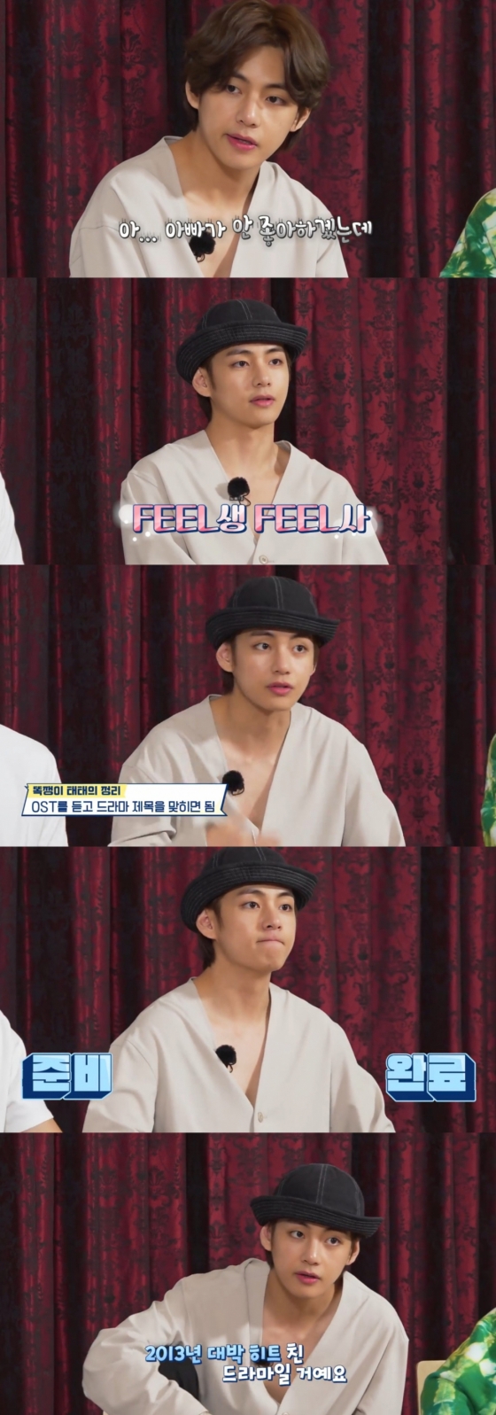 이날 뷔는 드라마 OST가 나올 때 마다 '도깨비'를 답으로 외쳐 스태프들 마저도 웃게 만들었다. 뷔의 지독한 '도깨비' 사랑에 자막도 '뷔는 도깨비 밖에 모르는 바보'라며 애정을 드러냈다. 계속 되는 음악 퀴즈에 뷔는 '노래 요정'으로 변신해 달콤한 목소리로 힐링 타임을 선사하기도 했다.