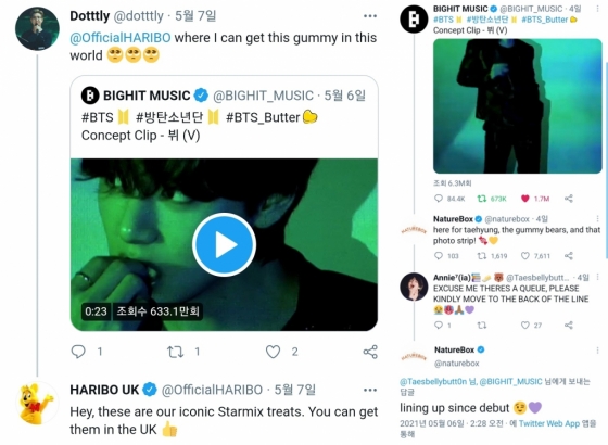 영상 속 뷔가 먹고 있던 젤리까지 큰 주목을 받자 해당 제품을 제조하는 세계 최대 젤리 브랜드 'HARIBO'(하리보)도 적극적으로 나섰다. 하리보는 UK 공식 트위터 계정에서 팬이 뷔의 영상에 "이 젤리를 어디서 먹을 수 있냐"고 묻자 "Hey, these are our iconic Starmix treats. You can get them in the UK!(헤이, 이것이 우리의 상징적인 스타믹스 간식입니다. 영국에서 구할 수 있습니다!)"라는 답변으로 스타 마케팅 기회를 놓치지 않았다.