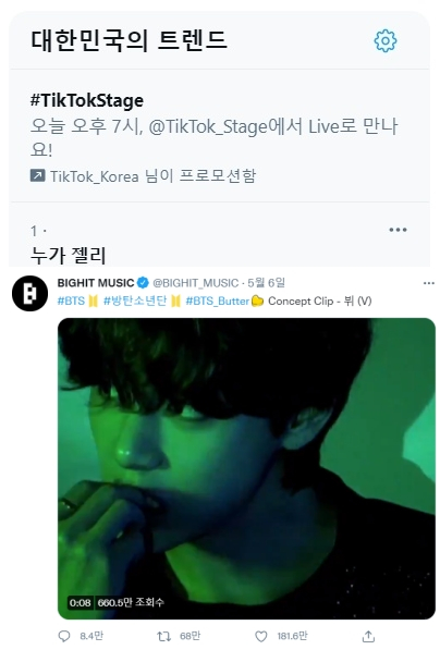 지난 4일부터 순차적으로 공개된 'Butter' 콘셉트 클립 중 뷔의 영상은 제일 늦게 공개되었음에도 불구하고 11일 기준 트위터 공식계정에서 가장 높은 '좋아요'와 '재생횟수'를 기록하며 뜨거운 인기를 누리고 있다.