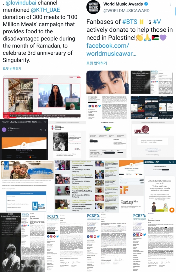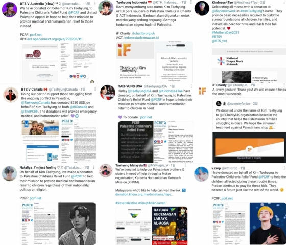 'Taehyung Malaysia'는 팔레스타인 가족을 돕는 단체 KHOM에, 'Taehyung Indonesia'는 'iF Charity'와 'ACT Indonesia'에 기부, 어려움을 겪고 있는 이들에게 도움을 전하며 곧 평화가 오기를 기원했다.