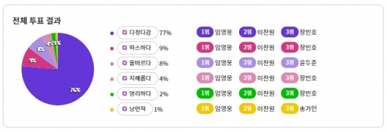 임영웅 매력으로는 '다정다감'이 77%로 1위로 꼽혔으며, 이어 '따스하다'(11%), '올바르다'(6%), '지혜롭다'(4%) 순이었다.