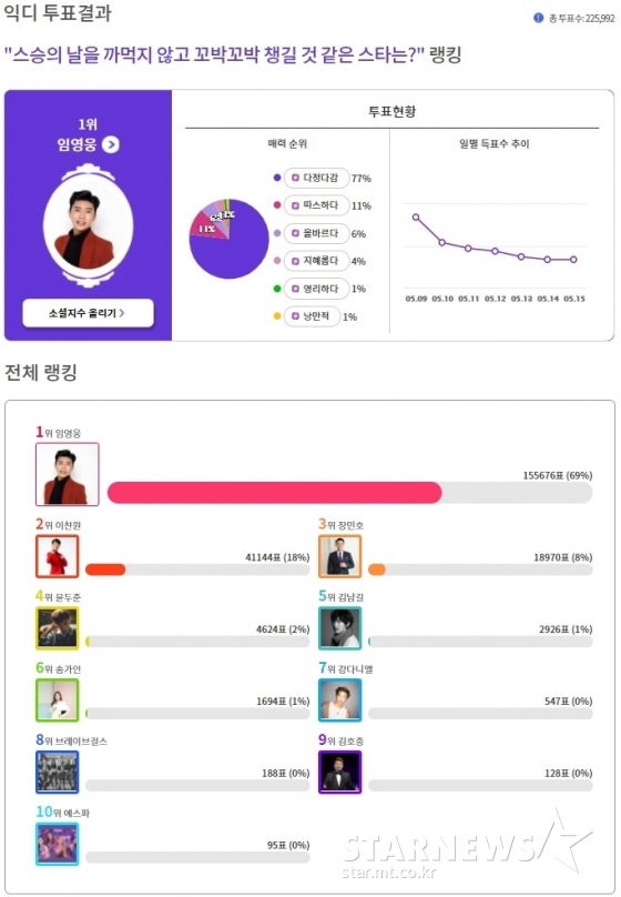 임영웅은 지난 9일부터 15일까지 익사이팅디시에서 진행된 '스승의 날의 까먹지 않고 꼬박꼬박 챙길 것 같은 스타는?' 설문에서 총 22만 5992표 중 69%의 압도적인 득표율로 15만 5676표를 얻어 1위에 올랐다.
