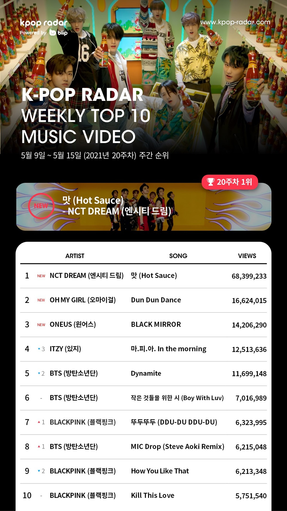 NCT 드림의 신곡 '맛(Hot Sauce)' 뮤직비디오는 케이팝 레이더 20주차 집계 기간 (5월 9일 ~ 5월 15일) 동안 6,839만 뷰를 기록하며 1위에 올랐다.