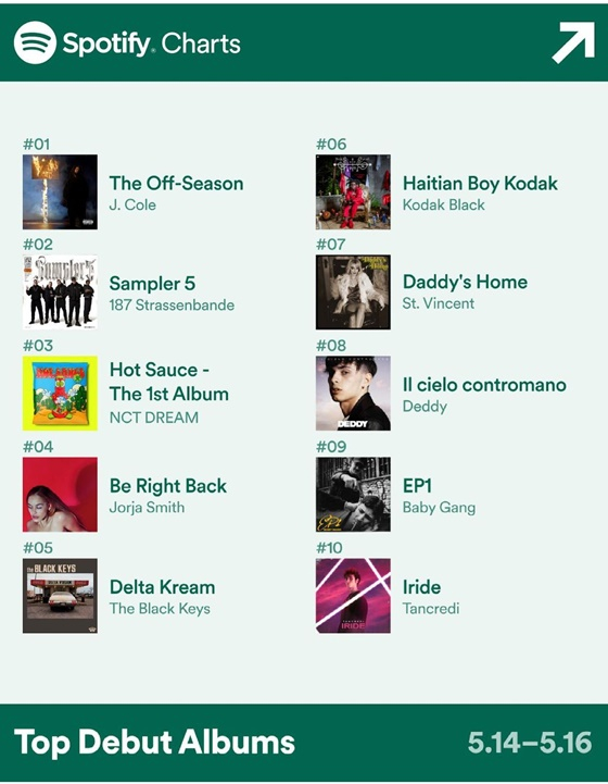 스포티파이는 18일(한국시간 기준) 지난 14일부터 16일까지 집계한 글로벌 '톱 데뷔 앨범즈 10'(Top Debut Albums) 차트를 공개했다.