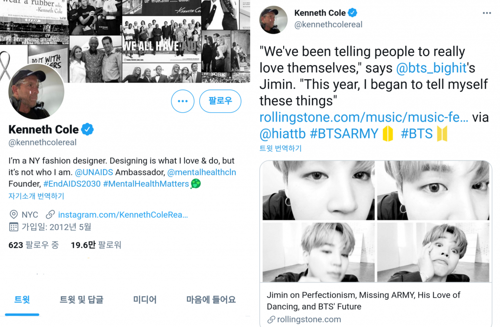 글로벌 유명 패션 기업 대표 케네스 콜(Kenneth Cole)은 지난 19일 "'우리는 사람들에게 자신을 정말 사랑하라고 말해왔어요'라고 지민이 말했어요. 올해, 저는 이런 것들을 스스로에게 말하기 시작했습니다"라는 글과 함께 지민의 롤링스톤(Rolling Stone) 인터뷰 기사를 SNS에 게시했다.