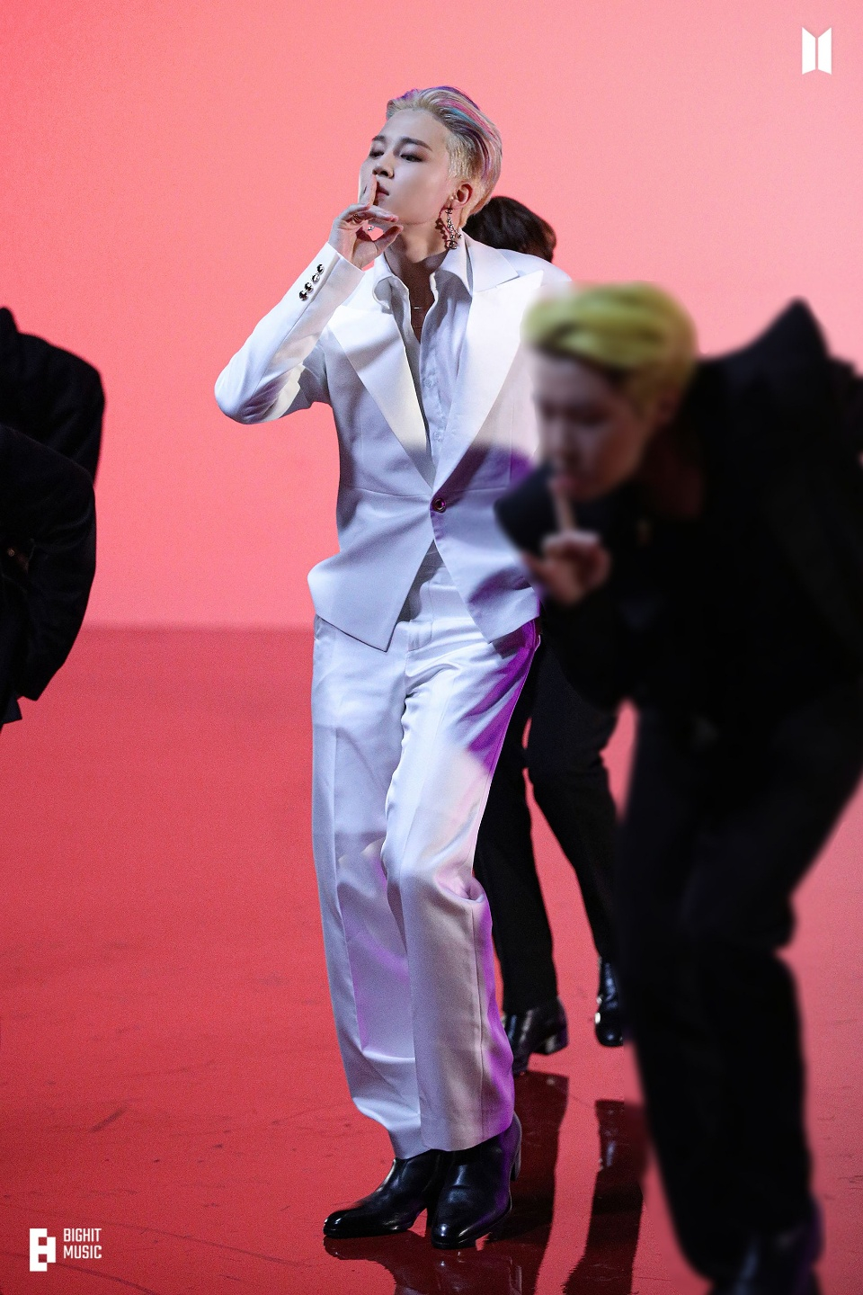 지민은 단독 파트의 무대 한 장면을 포커스로 한 사진에서 올 화이트 수트를 입고 고개를 살짝 들어 올려 손가락을 입술에 댄 관능적인 '쉿' 포즈로 팬심을 설레게 했다.