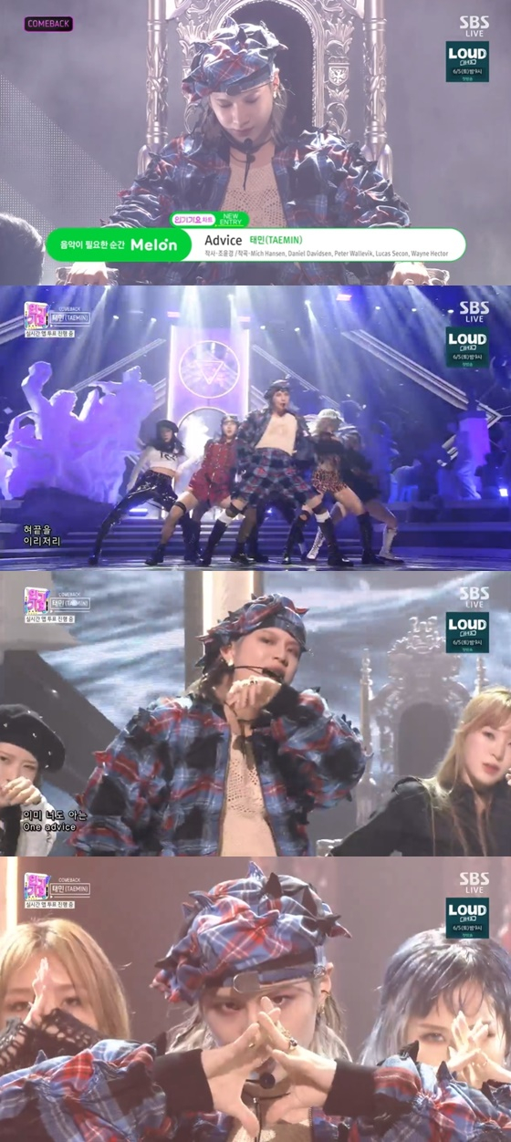 한편 이날 태민이 군입대 전 솔로 컴백 무대를 꾸몄다. 'Advice'는 고정관념에 사로잡혀 상대를 재단하는 이들을 향한 경고 메시지를 담은 웅장한 R&B 곡이다. 태민은 곡 'Advice'에 맞춰 컴백 무대를 선보였다. 태민은 오는 31일 군입대 한다. 태민은 군입대 전 컴백해 다크하고도 카리스마 넘치는 매력을 자랑했다. 또한 팬들에게 위로가 됐으면 한다는 바람으로 새로운 변신에 나서기도 했다.