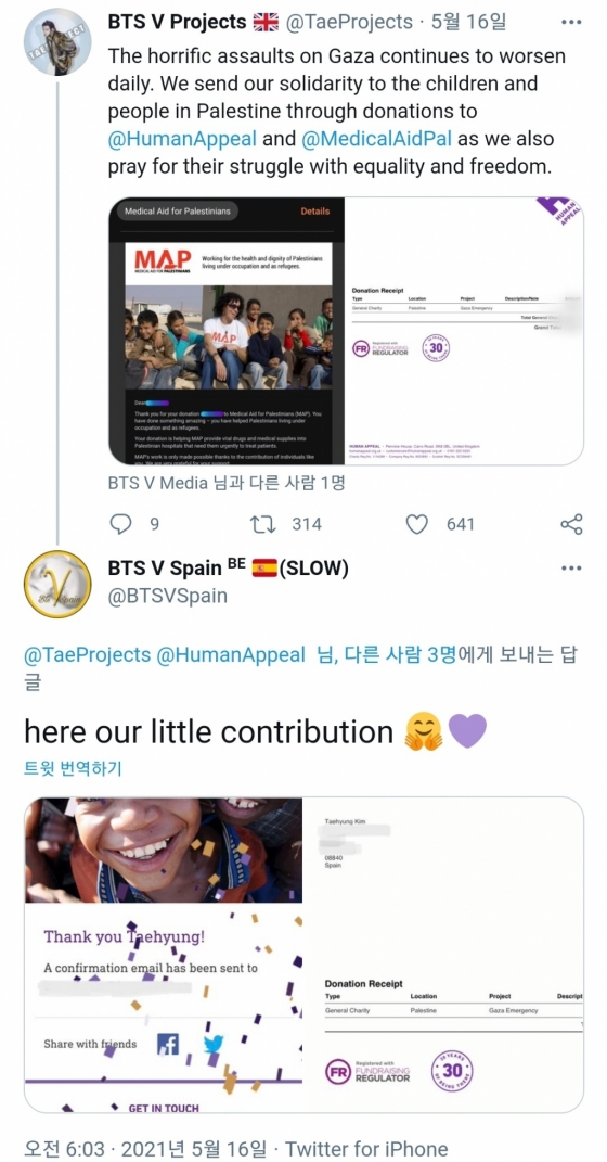 뷔의 영국 팬베이스 'BTS V Projects'는 "우리는 기부금을 통해 팔레스타인 어린이와 사람들에게 연대를 보낸다. 평등과 자유를 위한 투쟁을 응원한다"고 밝히며 '휴먼 어필'(Humal Appeal, 인도주의적 구호와 개발을 지원하는 영국의 NGO), '팔레스타인 메디컬 에이드'(Medical Aid for Palestinians, 팔레스타인 난민의 건강과 존엄을 위한 의료 지원)에 기부 사실을 전했다.