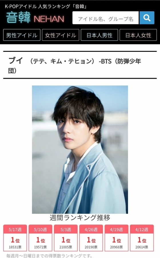 뷔는 지난 17일부터 23일까지 일본 K팝 아이돌 랭킹 사이트 '네한'(NEHAN)에서 진행된 'K팝 남자 아이돌 랭킹' 투표에서 뷔가 총 1만 8531표를 획득, 8주 연속 1위에 올랐다.