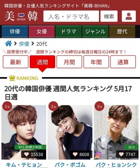 뷔는 일본의 한국 배우 인기 랭킹 사이트 '비한(美韓)'의 '20대 한국 배우' 랭킹에서도 1만 5538표를 획득하며 3주 연속 1위를 기록했다.