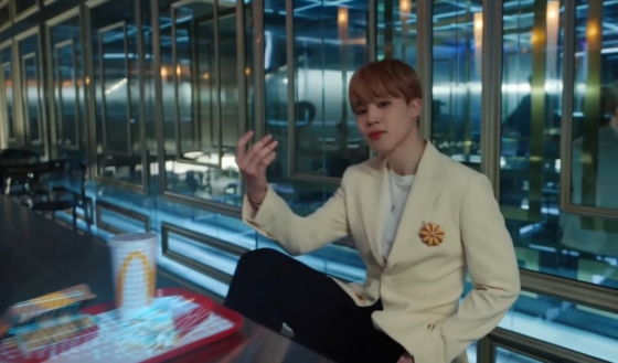 지민은 화려한 네온사인 인테리어가 돋보이는 맥도날드 매장을 배경으로 크림색 재킷과 블랙 슬랙스를 입고, 샤넬 브로치 포인트 스타일링의 세련된 패션으로 등장부터 고급스러운 외모로 시선을 사로잡았다.