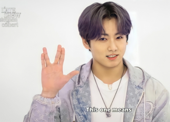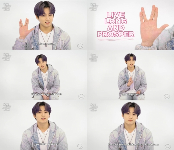 정국은 벌칸족 손인사인 '벌칸 살루트' 포즈를 취하며 "이것은 '장수와 번영을' 라는 뜻이다"라고 입을 뗀 후 "제가 만든 것인데 '스타트랙'이 저한테 이걸 배워갔다"고 이야기 했다.