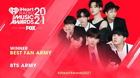 방탄소년단은 27일(현지시간) 미국 LA 돌비 극장(Dolby Theatre)에서 진행된 '아이하트라디오 뮤직 어워드 2021'에서 디지털 싱글 'Dynamite'로 '베스트 뮤직비디오(Best Music Video)' 부문과 최고의 팬덤에 주어지는 '베스트 팬 아미(Best Fan Army)' 부문을 수상하며 2관왕에 올랐다.