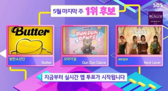 방탄소년단, 오마이걸, 에스파가 SBS '인기가요' 1위 후보에 올랐다.