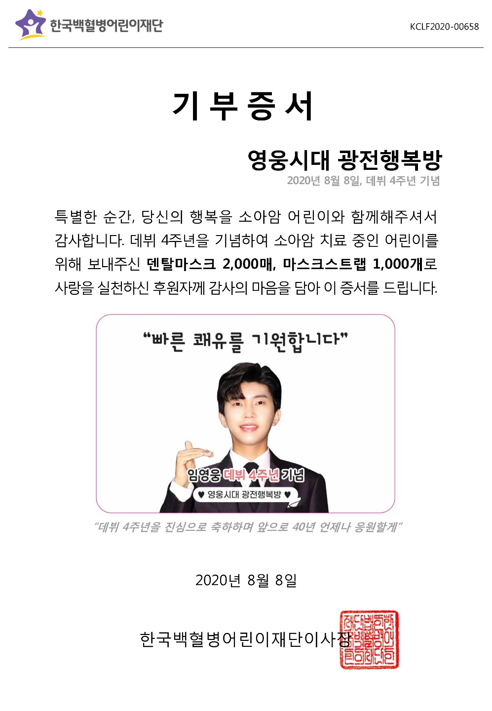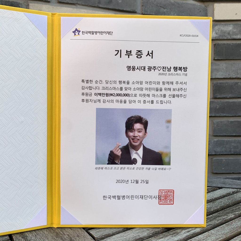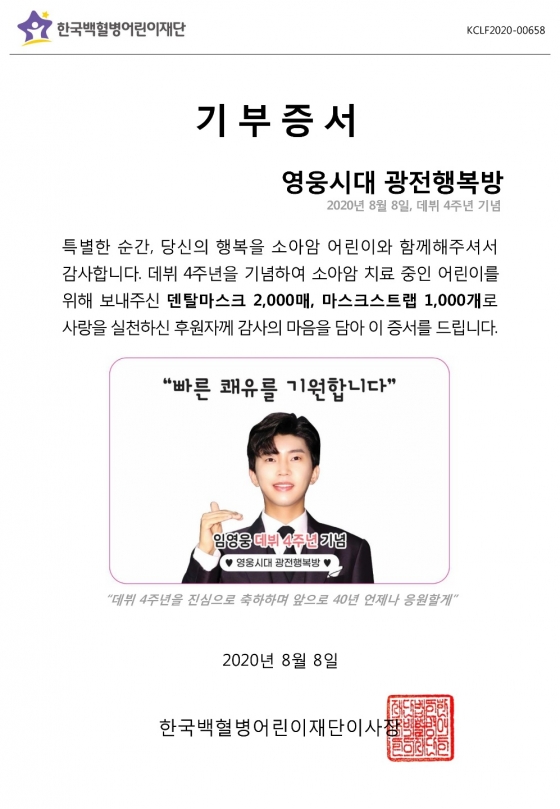 '영웅시대 광전행복방'은 봉사단 결성 이후 2020년 8월 임영웅 데뷔 4주년을 맞아 마스크 2000장, 마스크 스트랩 1000개를 소아암 전문 비영리단체 한국백혈병어린이재단에 기부, 인연을 맺었다.