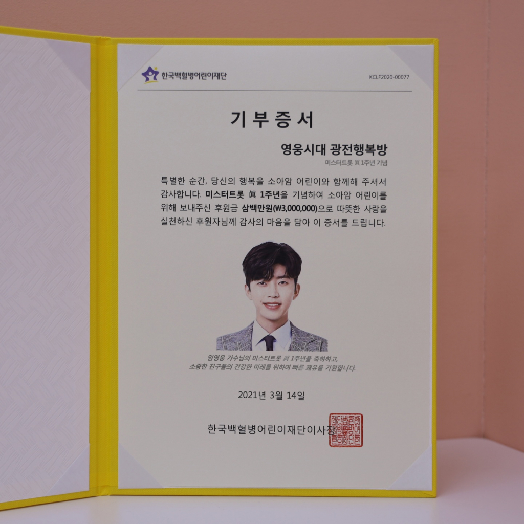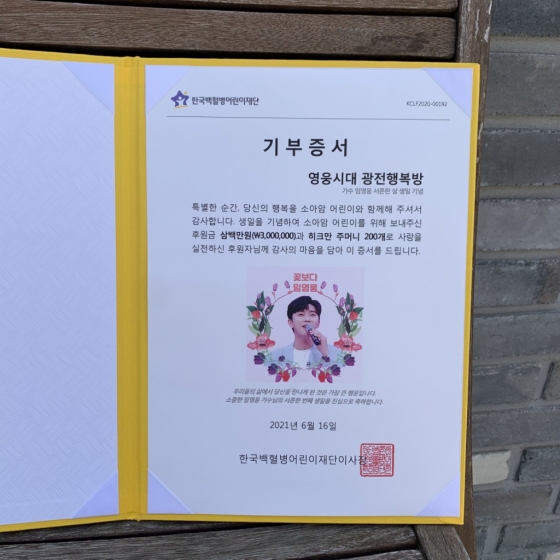 지난 3월 14일 임영웅의 '미스터트롯' 진(眞) 등극 1주년을 기념해 300만 원의 치료비를 기부했으며, 임영웅의 6월 16일 생일을 맞아서는 지난 12일 300만 원을 기부하고 소아암 투병 중인 어린이들을 돕기 위한 히크만 주머니 만들기 캠페인에 참여했다.