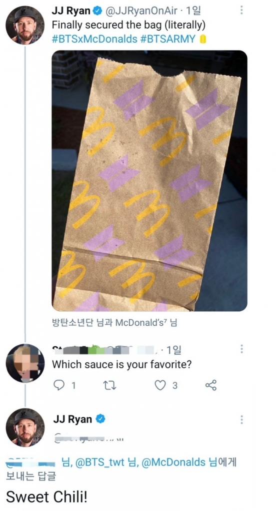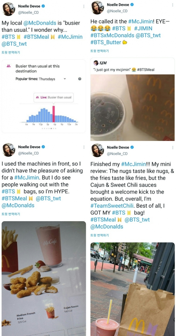 이어 '나의 맥지민'이라고 말하며 맥도날드를 직접 방문해 주문한 'The BTS 세트' 인증샷과 함께 짧은 리뷰에서 자신을 '스위트 칠리 소스 팀'(TeamSweetChili)이라고 소개하는 등 네 차례나 '맥지민'에 진심을 다하는 모습을 보였다.