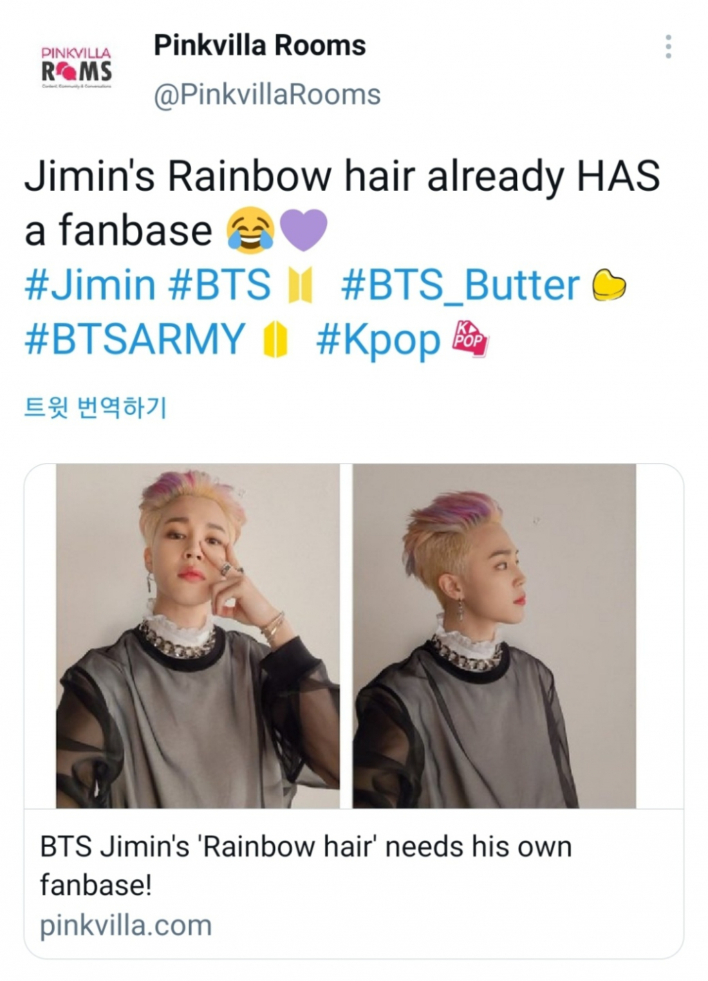 빌보드 핫 100 1위를 차지한 방탄소년단(BTS) 새 싱글 '버터'(Butter) 뮤직비디오 속 지민의 아이코닉 레인보우 헤어가 식을 줄 모르는 인기를 누리고 있다.